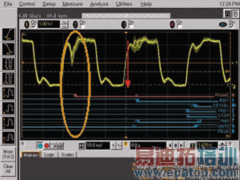 数字存储示波器(DSO)或模拟示波器可以判别信号是否正常,却不能告诉你信号是在什么时候变得不正常的,也就是说,它不能帮助你验证在电路特定的运作状态下,关键信号的质量是否过关,而这对于混合信号示波器来说却是很简单的事情。如图2所示,工程师用混合信号示波器可以发现PCI总线数采插卡在DMA控制器将总线控制权交回CPU后,采插内部的固化软件偶尔会跑飞,根本原因是这时时钟会出现不应该的幅值跌落,导致电路误认为新的时钟周期到来,从而产生误动作,据此工程师又进一步发现导致该幅值跌落的原因,从而解决了这个问题。使用时,只需注意把控制信号连接到逻辑通道上,根据PCI总线命令设定触发条件即可。