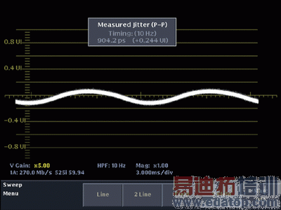 抖动在眼图中表现为水平迹线的加粗。眼图的展开程度将随着抖动的加剧而减小,直到接收器无法对数据进行解码为止。抖动用单位 间隔(UI)来度量,1UI与时钟周期相对应:SD为3.7ns,HD为673.4ps。抖动对系统的影响还取决于抖动的频率。SMPTE为测量抖动定义 了不同的频率带宽。定时抖动是对传输信号内抖动的一个总体度量,而校准抖动则可分离降低接收器恢复数据能力的抖动分量。