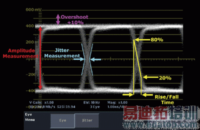 如表1中所定义的那样,上升时间和下降时间是在20%~80%的幅度点之间确定的。不正确的上升时间可能导致信号畸变,如振 荡和过冲;如果上升时间过长,可能会减少眼图中可用来采样的时间。上升沿和下降沿的过冲一定不能超过信号波形的10%。过冲有可能是不正确的上升时间所导 致的结果,但更大的可能是由于阻抗不连续或接收、发送端接中返回损耗不良而引起的。