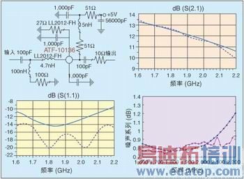 为获得小的输入驻波比和低噪声系数,ATF-10136低噪声放大器的设计需要兼顾噪声匹配和输入功率匹配。通过在场效应 管源级加上一小段微带线作为反馈使得最佳噪声匹配和最佳功率匹配点更加接近,并且提高低频的稳定性;源级直流通过电阻到地,栅极直流直接到地,为Vgs提 供负压,使用单+5V电源供电;输出端串联10Ohm的电阻以提高整个频带内放大器的稳定性;匹配电感使用东光公司的LL2012-FH系列高Q值、多层 陶瓷片状电感。使用Agilent高级设计系统(ADS)进行设计和仿真,仿真和实际测量结果如图2所示。