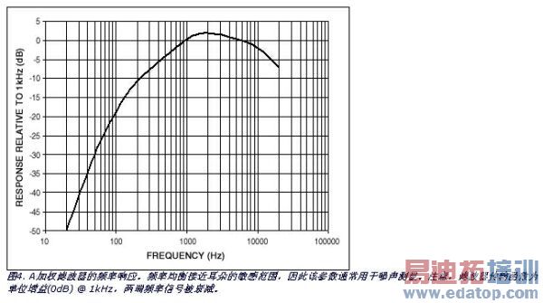 下一步,选择分析仪的A加权滤波(建议)或非加权22Hz至22kHz滤波器,将测量带宽限制在音频范围内。请注意,示波器的快速高电平瞬变并不表明有多少能量出现在音频频带内。人耳对扬声器或耳机瞬变信号的频率响应很有限。因此,增加A加权滤波(图4)更有利于分析,因为这样增强了人耳敏感的频率分量。某些音频分析仪不能选用A加权,这种情况下,应限制人耳频率响应的带宽。音频测试设备中常用的限制带宽是22Hz至22kHz,带宽限制滤波器大概能达到20kHz的平坦响应(通常为人耳的上限)。