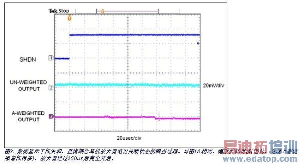 第二种瞬变过程,即直流耦合耳机放大器(图2),似乎淹没在A加权滤波之前示波器的噪声底中。对于这种放大器,大部分音频来自从关断到完全工作时产生的直流失调电压。由于失调只有几个毫伏,没有经过滤波的信号不能精确决定咔嗒声的大小。采用A加权滤波后,从噪声基底中提取出直流耦合耳机放大器失调产生的咔嗒声,获得更客观的测量结果。 (注意,没有显示滤波后的信号标度V/div。)