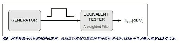 在记录测试结果、对结果进行直接对比之前,应对测试装置进行校准。此外,还需要验证等效分析仪记录的总能量,事实上,这一记录与输入幅度成线性关系。只有这样,才能准确记录咔嗒声的能量,特别是在音频频带出现快速上升瞬变时。简单校准需要一个函数发生器和一个同等的分析仪。 (参考图B示例。) 按以下步骤进行校准: 1在等效音频分析仪的输入加载一个幅度已知的0.5Hz方波。 2 设置同等分析仪检测A加权后的峰值电压。 3 记录各种输入信号幅度的峰值电压读数。