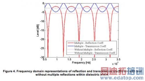 图4显示的曲线图为:方程式18—多次反射的反射系数,方程式22—多次反射的传输系数,方程式23—无多次反射的反射系数,方程式24—无多次反射的传输系数。为了便于说明,规定电介质模块的相对介电常数为“10”,长度为10cm,并且介质1的相对介电常数为“1”。图4表明,反射和传输系数仅在“多次反射”情况下才呈现纹波,其为多次反射的结果。但是,“无反射”响应并没有显示出任何纹波。通过图5所示时域响应和传输系数时域响应,我们可以看到更好的多次反射。在“无多次反射”情况下,我们只能看到一个大峰值(原因是Et1)。然而,在具有大峰值的“多次反射”情况下,出现两个相对更高水平的峰值(原因是Et2和Et3),表明电介质模块内存在多次反射。