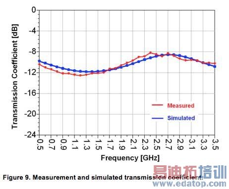 图8为前面小节中模拟传输线的评估电路板照片。我们将30欧姆电阻器放置于评估电路板(EVM)输入和输出SMA连接器结点处,其以黄色圈出。图9显示了重叠于蓝色模拟线上的红色传输线的测量得传输系数。该测量数据还显示了传输线输入和输出处30欧姆电阻器错配引起反射带来的纹波响应。