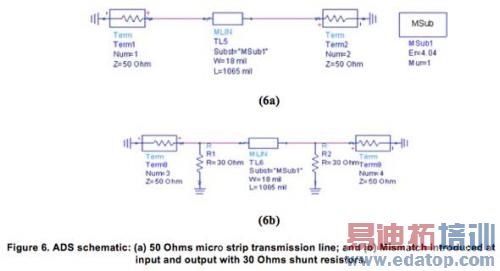图6.ADS原理图:(a)50欧姆微波带传输线,(b)30欧姆分流电阻器输入和输出端出现的错配。