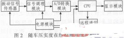 其主要工作过程是:振动信号传感器采集到振动压路机的振动模拟信号,并将该信号送入信号调理模块进行去噪、放大、滤波等处理,然后送入A/D转换模块进行模/数转换,转换后的数字信号被送入CPU单元,在CPU单元被进一步分析和处理,最终得出压实度值,被显示到随车的显示器上,供压实作业人员实时察看压实状况。