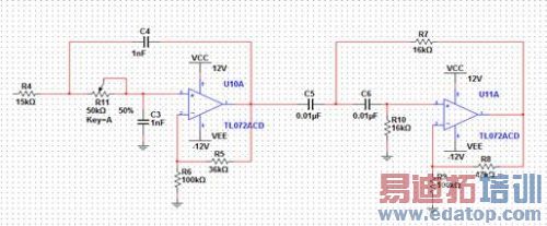 图-32.3滤波电路参数计算 滤波电路如图-4所示,该滤波器为二阶带通滤波器。高通部分用于滤除直流分量,低通部分用于滤出10kHZ,30kHZ,50kHZ的正弦波。由截止频率公式