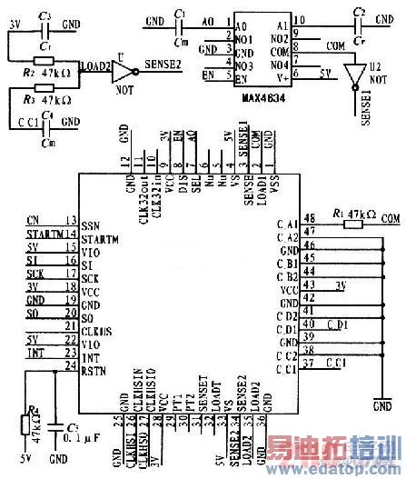 本测量电路需要控制器件来控制数据的读取和写入,选用结构简单,功能强大,并且兼容SPI串行接口的PICl6LF874单片机。由于PS02l的外围接口是SPI,因此单片机能很好的控制PS02l工作,同时测量数据可以通过USART串行接口送入到上位机中。单片机的连接如图2所示,PS02l的连接图如图3所示。