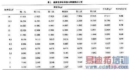 表1反映了被测电容测量值和标称值之间的相对误差,同时也得知被测电容电容值越大,测量值和标称值相对误差越小。由于被测电容受到环境温度、焊锡量多少以及被测电容质量等因素的影响,存在一定的误差。通过多次测量进行平均,以获取更稳定的电容值。在标定好的系统下,对固定电容进行测量来验证测量模块的精确度,测量值和标称值非常接近,可认为被测电容标称值误差较小,进一步得知电容测量模块测量精度较高。