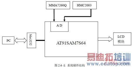 本系统的硬件结构如图2.4 -1 所示。 由于At91sam7s64 具有片上A/D 转换器而且具有8 选1 模拟复用器,使得MMA7620Q 和HMC2003 可以直接与微控制器相连而不必外加A/D 转换器和复用器,不仅降低了系统的 成本和体积,提高了系统的集成度,同时减少了误差源,提高了精度。经过A/D 转换的测量数据经过ARM 核的处理后,被送到串口LCD 并通过RS232 接口送入PC 机进行进一步的分析。