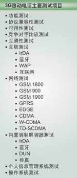 目前,为了满足3G市场对测试解决方案的要求,测试方案提供商已经在协议测试、互通性测试、网络基础架构测试、信道测试、基站测试及3G测试案例展开竞争。3G系统性能测试和优化是目前业界关注的焦点。CDMA测试论坛(www.cdg.org)和UMTS论坛 (www.umts-forum.org)汇聚了领先的3G测试方案提供商,例如Agilent科技、Anristu无线解决方案、Comarco无线技术、Ericsson、Lucent技术、Nokia、Racial Instruments、Rohde&Schwarz、Spirent通信、Sprint和Verizon无线等公司。