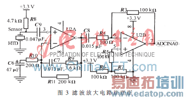 测量过程中,首先由DSP调制出PWM信号,通过可编程运放(PGA)调整波形幅度后,再经功放电路功率放大后连接到激振器的正负极。激振器的测杆将激励信号施加到混凝土试件中间点, 试件在外力作用下振动。由于压电效应,拾振器中的压电陶瓷片将试件因受迫振动而产生的机械波转换为电压信号(Vp-p<1 mV),该非平稳电压信号经低通滤波器滤除高频干扰后送至由LM833构成的单端运放电路放大1 000倍,其滤波放大电路如图3所示。
