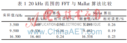 由于通常制备的混凝土试件的共振频率分布不均匀且难以预测[7]。试验中,为了测试系统的计量准确度,使用了函数信号发生器来模拟激振波形:信号源输出不同中心频率下峰值为0.5 mV的sinx/x周期函数波形,利用DSP硬件平台测试FFT算法与Mallat算法在同样采样点数下的谐振频率测量的相对误差,结果如表1所示。