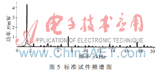 为验证测试系统中算法的精确度,在试验电路中:DSP的PWM周期定时器设定值FT从50 Hz~1 kHz范围内以0.25 Hz/ms增加,当FT达到1 kHz后,以1 Hz/ms增加到5 kHz为止,为了减小激振器中电磁线圈的温漂,将PWM的脉宽调制为0.3,激振器输出平均功率PT=5 W,功率谱计算时间平均为3.2 ms,图5是标准试件频谱图的打印输出结果。