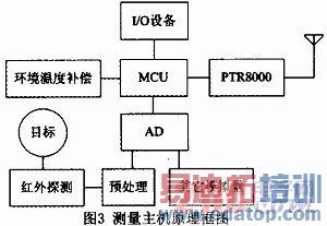 典型的红外测温系统由被测对象、红外测温主机、发射传输装置及接收装置组成。本文采用测量主机与无线通信从机的双机模式实现。图3为测量主机原理框图,测量主机完成红外温度数据的采集处理,由红外探测系统和单片机MSP430F149组成。采用多路AD芯片(MSP430内部AD)实现模拟量到数字量的转换,并且留有其它模拟量的测量通道,可扩展诸如湿度等其他模拟量的监控。为了补偿环境温度可连接环境温度传感器DS18B20。采用无线收发模块PTR8000实现数据的无线传输,PTR80005特有内置环形天线,可直接与单片机连接,无须外接其他器件,实现数据的无线收发。