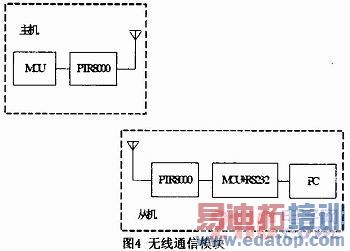 该系统中主机的任务是完成数据采集与处理,包括进行A/D转换、环境温度补偿,对即将传送来的数字信号进行组织处理。发射端的PTR 8000将单片机的信息调制成射频信号发出,接收端的PTR8000模块将接收到的信息解调成为TTL电平,由单片机处理后经由RS232接口送到PC,供计算机后期处理。