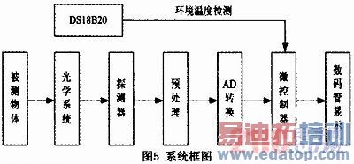 系统的整体框图如图5所示。由于被测物体的发射率难以准确确定,在系统设计中,为了尽可能地提升系统精度,获得较为满意的增益,把放大器最后一级的放大倍数设计成可调的。