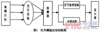 光学系统汇聚其视场内的目标红外辐射能量,视场的大小由测温仪的光学零件及其位置确定。红外能量聚焦在光电探测器上并转变为相应的电信号。由于该电信号十分微弱,因此要经过放大处理后再送入信号处理电路,同时为了消除环境温度的影响,增加了补偿电路,然后经仪器内部的算法和目标发射率校正后换算为被测对象的温度值,最终通过传输线路显示到输出终端。