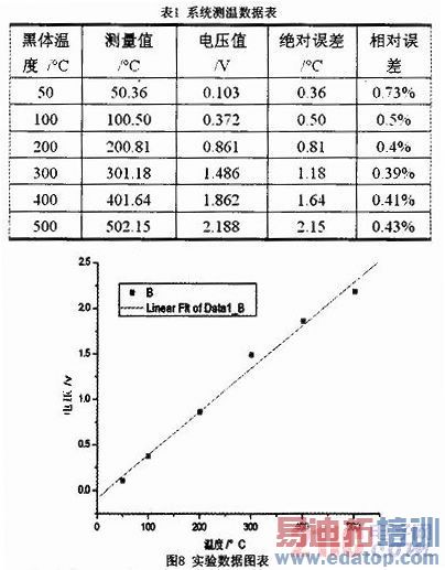 考虑到系统的测温范围在500℃以下及其它因素,实验采用干体炉作为热源,该热源最高可达850℃左右,环境温度选为18℃,即291.15K。假定发射率为0.97。表1为系统测温数据。图8为实验数据图表,数据源来自表1。