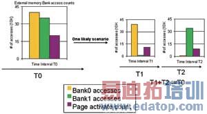为了说明这一点,考虑这样一个情况,总线在时间区间T的活动表明,对所有组的访问是均衡的,但离页访问比例较高,但在较小时间区间(T1、T2,其中T1+T2=T)中记录的总线活动表明对各组的访问是不均衡的,见图2。如果缓存布局可对时间区间T1和T2分别进行优化,则有可能显著改善系统性能。