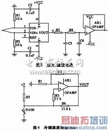 金属的电阻随温度的上升而增加,利用此特性制成的传感器称为热电阻,很多材料可制作热电阻温度传感器,其中最常用的材料为铂,铂电阻的电阻率高、电阻与温度成线性关系、测温范围广、精度高。目前常用的铂电阻有两种:Pt100和Pt10,Pt100铂电阻在温度为0℃时电阻为100Ω,100℃时电阻为138.51Ω,Pt10在温度为0℃时电阻为10Ω,本设计采用Pt100对冷端温度进行测量,将测得的冷端温度送给计算机,通过软件计算进行补偿。冷端温度测量电路如图4所示。