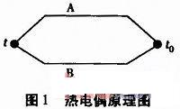 图1中,由两根不同导线A和B组成电路,连接成的接点温度分别为t和t0,则电路中产生的热电势等于接点的电动势之差,如下式: