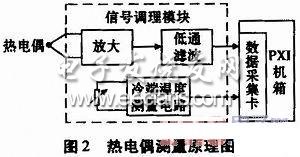 系统硬件由热电偶、信号调理模块、数据采集卡、PXI机箱组成,如图2所示。本设计采用K型热电偶,使用温度范围为-200℃~1200℃,其输出电压信号为mV级,因此,信号调理模块包括信号放大电路、滤波电路以及冷端补偿电路。热电偶测试的冷端补偿通常有两种方式:硬件补偿和软件补偿,本设计采用软件补偿的方式。