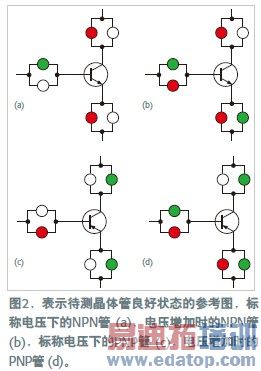 当一只正常晶体管插在测试端子之间时,它限制电流只能沿某些方向流动。串联的LED表示出这些方向,因此指示出了晶体管的类型。例如,对NPN晶体管,LED发光为红-绿-红,而对PNP晶体管,发光为绿-红-绿。