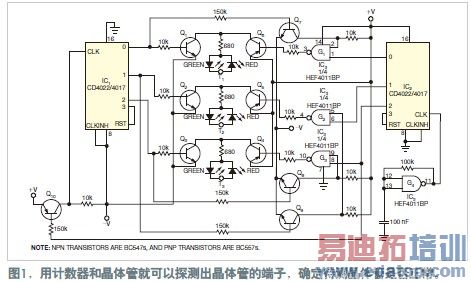 电路使用两只CD4022或CD4017计数器IC1和IC2,一只单门方波振荡器G4,以及一个CD4011四与非门,G1至G3。每个测试端子串接一对LED,用于指示电流的方向。LED的颜色直接表示出晶体管的结端。