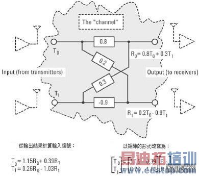 它看起来且实际上也比传统的无线电系统复杂,但最大的好处是不需使宽,也不需具备更佳的信号/噪音比,就能够以高出很多的速率传送资料。以一个方形矩阵A 来说,其单数值是AHA 特征值的方根,其中AH 是A 的共轭转置(Hermetian)。最简单的方法就是把单数值想成可以用来衡量空间通道有多强及分离度有多好的基准,而最理想的MIMO 通道特性是单数值够高且大小相等。找出通道系数的方法有几种,请参考图3,最简单的一种就是在T0 和T1 发射一对已知的不同信号,然后量测出现在R0 和R1 的信号。这是一个(non-blind)的已知通道粹取例子,系统运作的(training period)与用来传送使用者资料的时间是截然不同的。这是针对802.11n 的运作所提出的方法,也是802.11a 中所使用之多频(multitone)通道估测法的延伸。在图3 中,T0 和T1 代表透过无线电通道传送的信号,范例中的系数指的是通往R0和R1 接收天线的途中,所出现与频率无关的路径损耗及交互耦合。
