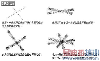 其中,H 是通道系数的矩阵、n 是噪音因数的矩阵、R 和T 是描述接收到和传送出来之信号的矩阵通道粹取过程中产生的热噪音(thermal noise)和量化噪音(quantization noise)效应对WLAN封包以及射频数字信号处理(DSP)的设计有相当大的影响。另一种看待通道运作的方法如图4 所示。图中的线代表的是R0 和R1 的方程式,线的交叉点则代表我们找出通道系数的准确度有多高。在左上角的图中,可以很清晰地辨别两条线,表示其信号/噪音比很高。而且,这两条线几乎是正交的(彼此呈直角交叉),因此可以非常准确地测定交叉点,表示可以准确地解出通道方程式。在左下角的图中,线就没有那么明显清楚了,表示是一个低信号/噪音比的信号。两条线也几乎呈正交,因此仍然可以相当准确地解出交叉点。在右上角的图中,两条线的角度缩小了很多,因此两条线交叉的区域大幅增加了,使得斜率的估测精确度变差了。