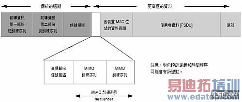 图5:经过修改的WLAN 封包可进行MIMO 运作,Greenfield1 或Pure Mode2 封包不需要提供传统的週期(legacy period),因此可以达到更高的传输率。