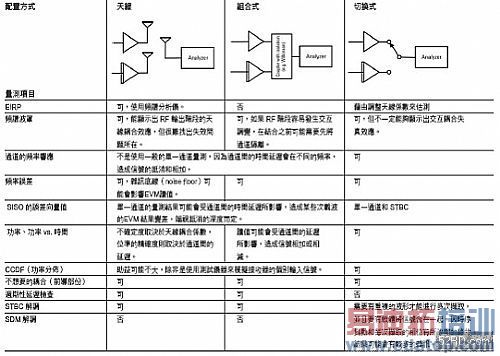 双通道量测可以进行更完整的MIMO 无线电分析。交叉通道量测可验证信号间的频率和时序关系,也可以显示出每个个别通道的误差如何累加在一起,降低发射器和接收器的空间通道效能。产生信号时,时序对齐和共用本地振盪器的需求与6.2.1 节所讨论的类似。透过个别的组件量测RF 相位关系时,使用共用的本地振盪器将是最容易的方式,会需要採用向量网路分析所使用的方法,在测试连接点进行相位校准。若要确保量测的稳定一致性,就需要特别留心RF 匹配的问题。相反地,在生产线上测试完整的发射器时,要求可能反而没这么高。可执行多通道发射器量测的硬件有三种,如表3 的摘要所列。