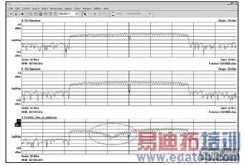 除了最高功率的装置以外,这种情形可能不会构成频谱安规的问题,但会对频谱噪音波罩(spectrum emission mask)量测造成影响,因为这项量测是利用最高的频段内(inband)峰值来设定参考位准所进行的,其影响是会提高波罩限制线。闸控式频谱分析是一种功能强大的方法,可以找出信号丛发期间的问题。图18尝试将两组发射器的输出组合在一起,最底下的轨迹就是信号合在一起的结果,频谱中下降点(圈起处)的位置和深度容易受到通道间的时序偏移和平衡所影响。使用合适的测试模式,或藉由量测适当的preamble symbol,或许可以应用这个原理,使用单一输入分析仪来进行简单的交叉通道量测。25 ns 的时间延迟会在20 MHz 宽的信号上造成180 度的相位偏移,或是让图10 中的下降点出现40 MHz 的反覆区间。