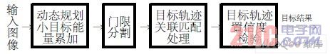 探测器与目标较远时,目标在红外图像上的成像面积很小,一般不超过探测器像元的大小,因此表现为小目标,而且图像信噪比很低。低信噪比条件下的小目标检测,首先要解决的是目标能量积累的问题,于动态规划的能量累加算法(DPA算法)可以对小目标进行有效的能量积累。如图1所示,DPA算法主要包括三个部分: ①基于动态规划的小目标能量累加; ②门限分割; ③基于轨迹关联与置信度检验的目标轨迹处理,下面对这三部分进行简单介绍。