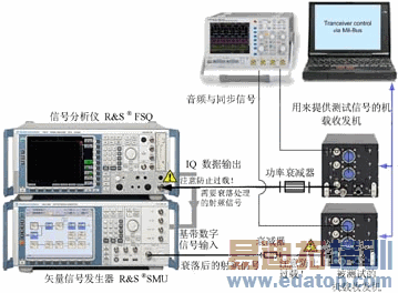 图4所示为军用快速跳频机载收发机的测试平台。信号源的衰落模块可以设置并为被传输信号引入毫秒级的信号延迟,使用该信号延迟,可以检测接收机(下侧设备)与发信机(上侧设备)之间的同步功能。实际应用中,两个彼此通信的飞机相隔数百公里远时,就可能出现这类延迟。测试时,参考收发机会发送一个射频信号至R&S FSQ 信号分析仪,信号分析仪将信号下变频至基带。这一过程中,所产生的数字 I/Q 流实时传送至 R&S SMU200A 矢量信号源。信号源内部的衰落选件为该信号施加预置的延迟、衰落和多谱靳速度场景,从而模拟诸如飞机较大的速度差异等实际环境。测试信号会上变频至射频频率传送至被测收发机,以解调出信号内容。使用示波器比对来自收发机的同步信号,可以检测是否获得了正确的同步。