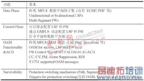 MPLS-TP 是IETF 和ITU-T 联合定义的以太网传输网络技术,MPLS-TP 基于MPLS 技术框架,针对传输网络特点做了一些优化,表1 列举了MPLS-TP的技术要求和传统MPLS的区别。