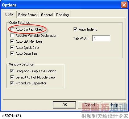默认情况下,E5071C VBA环境设定为自动检查语法差错,不过可以按照以下步骤关闭自动语法检查功能: