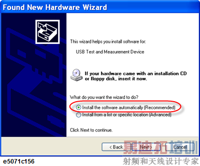 - 选择自动安装软件(推荐),然后单击Next(下一步)。E5071B的驱动程序能自动进行安装,并出现完成屏幕。点击完成完成程序。