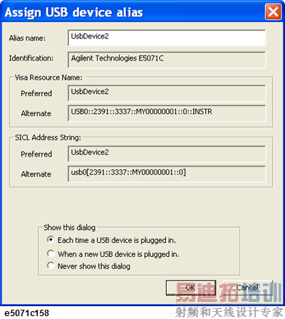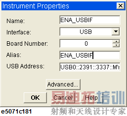 在仪器属性窗口,以别名(如:ENA_USBIF或E5071C_USB)显示了仪器的任意名字,在USB Address里添加USB地址。完成所有参数设置后,单击OK(确定)。