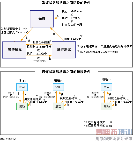 当执行(上图中的箭头e)以下两个命令之一后,触发系统切换到保持状态。接通仪器电源也会使触发系统进入保持状态。但是,当电源接通时,通道1的连续启动模式也是打开的,而且触发源设置为内部触发,因此,触发系统立即切换到等待触发状态,然后在测量和等待触发状态之间来回变化。