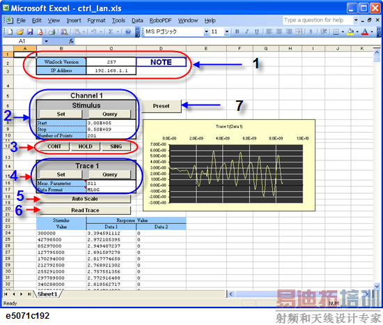 第4部分设置通道1中迹线1的测量参数和数据格式。点击设置,执行由设置表指定的设置操作,同时点击标有询问的按钮,恢复E5071C的当前设置。