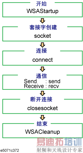 在(4)中,使用WinSock API的connect函数建立与E5071C的连接。如果发生了错误,该控制会向主程序返回消息。connect函数用socket描述符(输入)、socket地址(输入)和socket地址的大小(输入)作为其参数。