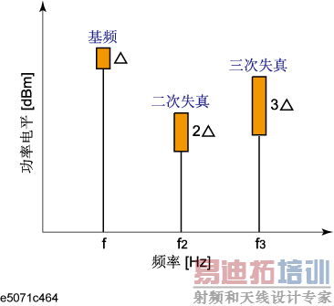 谐波失真是非线性设备(如混频器、放大器)的典型测量参数。如下图所示,二次失真和三次失真分别按基频信号的平方值和立方值增加。因此,失真分量将随基频信号功率而变,谐波失真可以作为二次谐波和三次谐波功率电平与基频信号功率电平之比加以测量。
