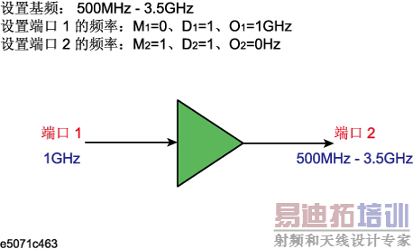 频偏功能允许在每个测试端口的频率不相同时进行测量。在这种情况下,可以使用下图所示的测量频率的设置示例进行测量。有关频偏扫描的设置,请参见 1. 设置频偏。