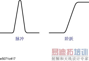 使用 E5071C,可以模拟 DUT 对两类信号(脉冲信号和阶跃信号)的响应。脉冲信号是一种脉冲形状信号,其中电压从 0 上升到某个值,然后再返回到 0。脉冲宽度取决于频率扫描范围。阶跃信号是电压从 0 上升到某个值的信号。上升时间取决于频率扫描范围内的最大频率。