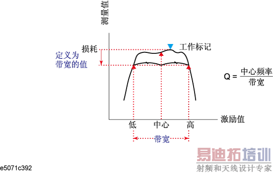 带宽搜索根据工作标记的位置确定迹线带宽、中心频率、截止点(较高频率一侧和较低频率一侧)、Q 和插入损耗的功能。通过带宽搜索确定的参数定义如下所示。