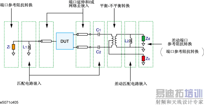在可以连接校准标准的连接器处进行校准之后,可以很容易将校准参考面移动到 DUT 的端子。可以移去不需要的网络,以消除测量误差(端口延伸、网络去嵌入)。