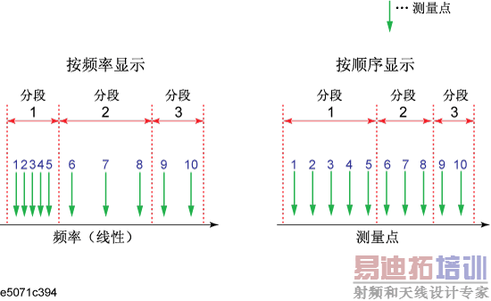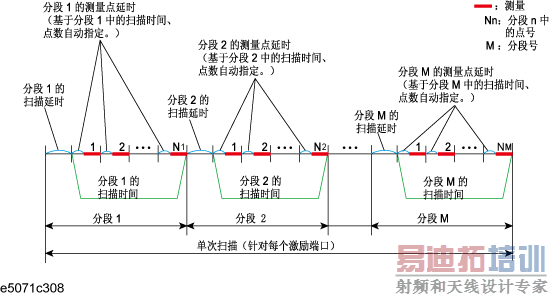 对于分段扫描,可以为每个分段设置扫描范围、点数、IF 带宽、功率电平、扫描延时、扫描方式和扫描时间。